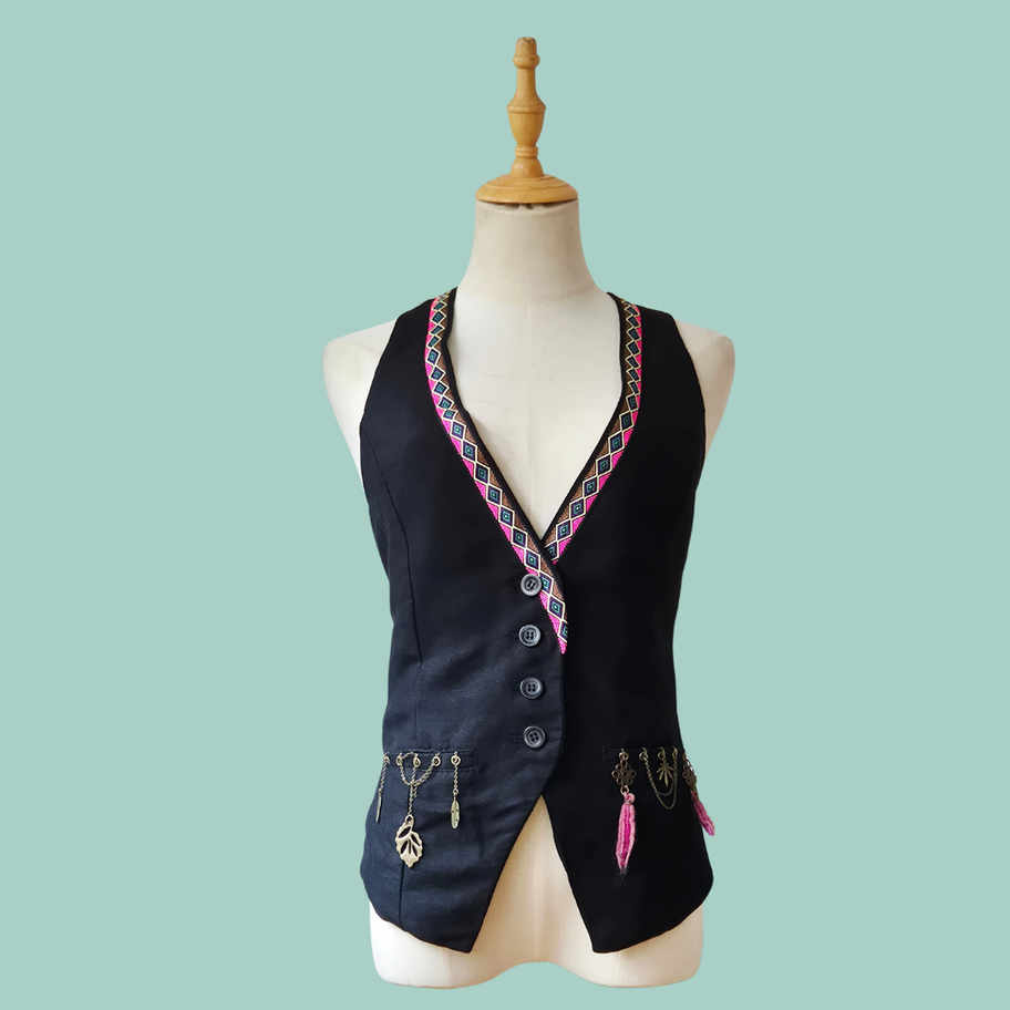 Fully upcycled from a plain black vintage store jacket, I transformed it with pink fringe edges, dangling charms, and tons of boho life.